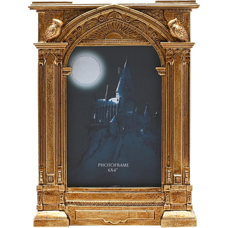 The portrait, gold resin photo frame showcases a metallic effect finish, complete with a 3D Hogwarts entranceway design. It is designed for display using the attached standing strut.