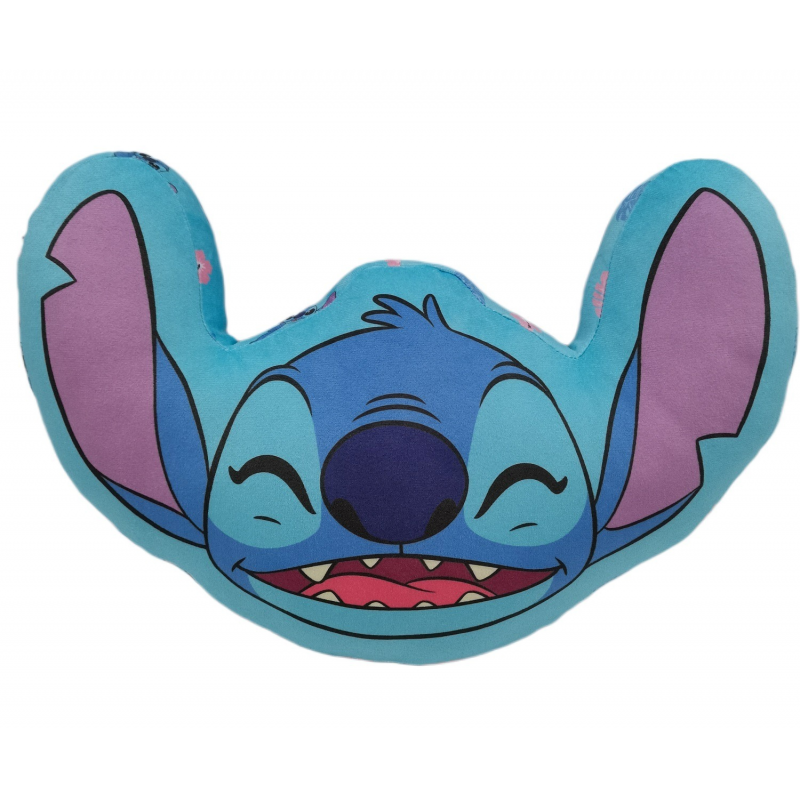 Cuscino ufficiale Lilo e Stitch in formato 3D con design a forma e immagine della testa di Stitch che ride con gli occhi chiusi, cuscino realizzato in 100% poliestere misura 40 x 28 x 6 centimetri, un regalo originale ed economico per qualsiasi fan della licenza Disney Lilo & Stitch.