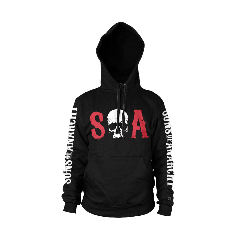 Felpa da uomo con cappuccio di Sons Of Anarchy con S-O-A logo, al posto della O c'è un teschio, con tasche sul davanti e sulle maniche la scritta Sons of anarchy. Su tessuto nero in cotone misto poliestere. Prodotta su licenza ufficiale da Hybris.