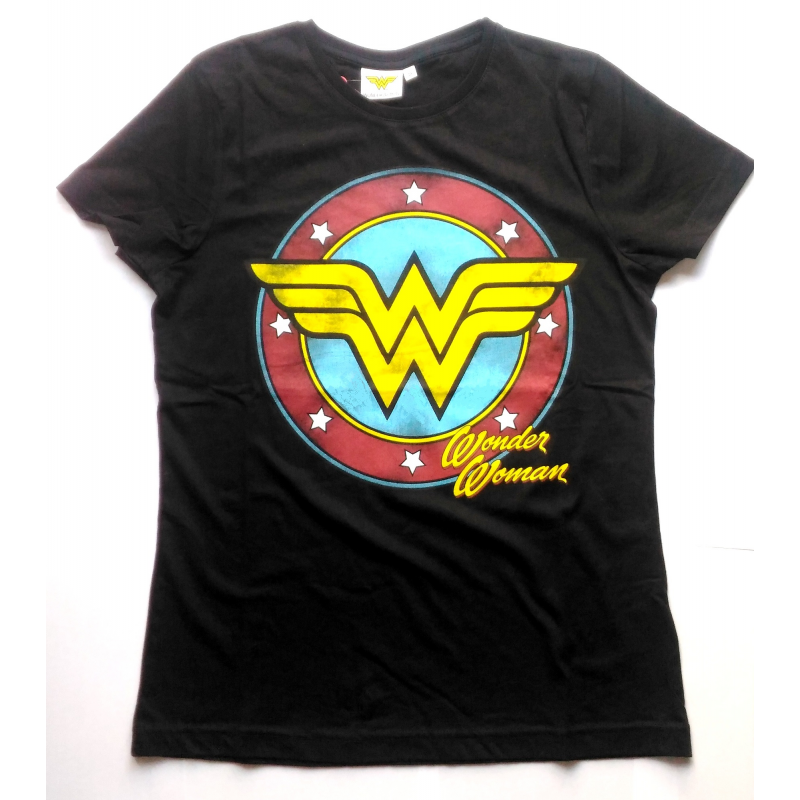 Bellissima t-shirt nera ufficiale con lo stemma originale dell'eroina Dc Comics Wonder Woman, in cotone con stampa serigrafata del classico logo, prodotta su licenza ufficiale.
